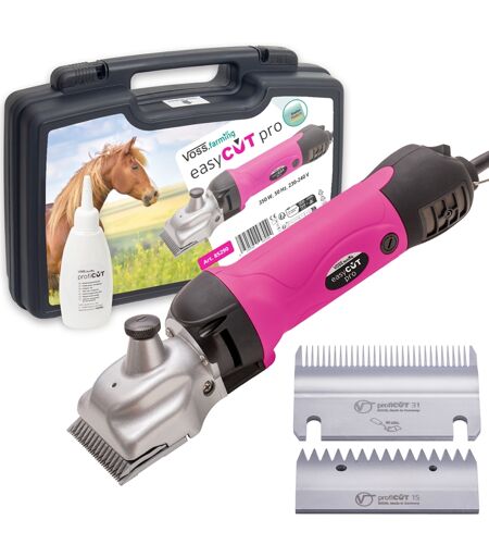 VOSS.farming easyCUT Pro Pferdeschermaschine Pink Aesculap Schermesser SetProfessionelle Pferdeschermaschine mit Aesculap SchermessernDie VOSS.farming easyCUT pro Pferdeschermaschine in pink bietet professionelle Schurqualität für Pferde und Ponys. Das Komplettset enthält hochwertige Aesculap Schermesser (31/15 Zähne) für saubere Schnitte.Die ergonomische Bauweise liegt gut in der Hand und ermöglicht eine einfache Bedienung auch bei längeren Schurarbeiten. Die leistungsstarke Maschine sorgt für präzise Schurergebnisse und das mitgelieferte Zubehör macht das Set sofort einsatzbereit.Die robuste Konstruktion und die professionellen Schermesser von Aesculap gewährleisten eine lange Lebensdauer und gleichbleibend gute Ergebnisse.Details:• Professionelle Pferdeschermaschine in Pink• Farbe: pink• Schermessersatz: 3mm (bereits vormontiert)• Restfelllänge: 3mm• Geräuschpegel: ca. 70 dB (A)• Hubzahl: ca. 2.800 Doppelhübe/min• Motorleistung: 350 W• Netzspannung: 230 Volt• Gewicht ohne Kabel: ca. 1.330g• Kabellänge: ca. 6m• Abmessung der Schermaschine (LxBxH): ca. 290mm x 79mm x 71mm• Aesculap Schermesser 31/15 Zähne vormontiert• Ermüdungsarmes Arbeiten über einen längeren Zeitraum• Sehr angenehm für schreckhafte Pferde• Zwei unterschiedliche Schnittgeschwindigkeiten wählbar• Einfaches und präzises Einstellen der Schermesser• Handliche Größe und laufruhig• Ansprechendes Design, ergonomisch und ausgewogen• Geringes Gewicht für ermüdungsarmes Arbeiten• Inklusive ZubehörLieferumfang:• 1x VOSS.farming ...