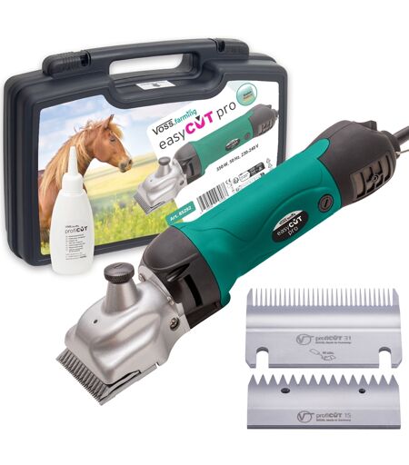 VOSS.farming easyCUT Pro Pferdeschermaschine Dunkelgrün Aesculap Schermesser SetProfessionelle Pferdeschermaschine mit Aesculap SchermessernDie VOSS.farming easyCUT pro Pferdeschermaschine in dunkelgrün bietet professionelle Schurqualität für Pferde und Ponys. Das Komplettset enthält hochwertige Aesculap Schermesser (31/15 Zähne) für saubere Schnitte.Die ergonomische Bauweise liegt gut in der Hand und ermöglicht eine einfache Bedienung auch bei längeren Schurarbeiten. Die leistungsstarke Maschine sorgt für präzise Schurergebnisse und das mitgelieferte Zubehör macht das Set sofort einsatzbereit.Die robuste Konstruktion und die professionellen Schermesser von Aesculap gewährleisten eine lange Lebensdauer und gleichbleibend gute Ergebnisse.Details:• Professionelle Pferdeschermaschine in Dunkelgrün• Farbe: Dunkelgrün• Schermessersatz: 3mm (bereits vormontiert)• Restfelllänge: 3mm• Geräuschpegel: ca. 70 dB (A)• Hubzahl: ca. 2.800 Doppelhübe/min• Motorleistung: 350 W• Netzspannung: 230 Volt• Gewicht ohne Kabel: ca. 1.330g• Kabellänge: ca. 6m• Abmessung der Schermaschine (LxBxH): ca. 290mm x 79mm x 71mm• Aesculap Schermesser 31/15 Zähne vormontiert• Ermüdungsarmes Arbeiten über einen längeren Zeitraum• Sehr angenehm für schreckhafte Pferde• Zwei unterschiedliche Schnittgeschwindigkeiten wählbar• Einfaches und präzises Einstellen der Schermesser• Handliche Größe und laufruhig• Ansprechendes Design, ergonomisch und ausgewogen• Geringes Gewicht für ermüdungsarmes Arbeiten• Inklusive ZubehörLieferumfang:• 1x VOSS.farming ...