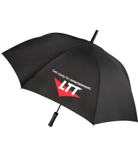 LTT Stockschirm mit Windproof-Features: Preislich attraktiver Automatik-Stockschirm mit Windproof-Features. , komfortable Automatik-Funktion zum schnellen Öffnen , Windproof-Features für höhere Gestell-Flexibilität und bessere Windsicherheit , flexible Fiberglasschienen , matt-schwarzer gerader Kunststoffgriff, höherer Korrosionsschutz durch schwarze Galvanisierung des Stahlstocks , Technische Daten: Schirm-Durchmesser: ca. 105 cm, Keilanzahl: 8, Gewicht: 426 g, Bezug: Polyester-Pongee, Griff: Kunststoff, Farbe: Schwarz, Druck: 2-farbiger Duck auf einem Segment, Motiv: LTT-Logo mit Slogan ...