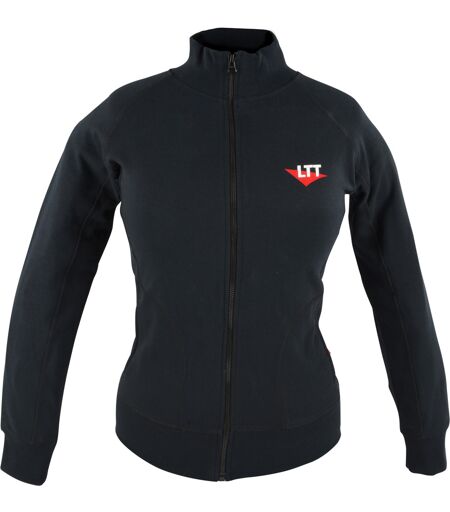 LTT Damen Sweatjacke: durchgehender Reißverschluss, hoher ZIP-Kragen, weiche Innenseite, 2 Seitentaschen, elastischer Ärmelabschluss und Bund, leicht tailliert, Farbe: schwarz, Material: 60 % Baumwolle / 40 % Polyester. ...