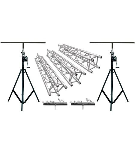 Bestehend aus folgenden Bauteilen:2 x Stativ mit Kurbel und T-Bar2 x Adapterhülsen für Wind-Up Stativ3 x Naxpro-Truss FD 34 Strecke 200 cm2 x Traversenadapter m.TV-Z. 28mm: Unser Stativ mit Kurbel und T-Bar ist ein absoluter TOP-Seller. Das Preis-/Leistungsverhältnis ist im Markt ungeschlagen und professionelle sowie semi-professionelle Anwender schwören auf dieses Kurbelstativ. Optionaler Adapter für Aufnahme von Spigot (TV-Zapfen 28mm) erhältlich.Das Naxpro FD 34 Traversensystem ist ein TÜV geprüftes Traversensystem in 4-Punkt Ausführung, besonders gut geeignet für den Messe- und Ladenbau, sowie Veranstaltungstechnik und als Tragsystem für Beleuchtungstechnik. Durch kompakte Bauform kombiniert mit hoher Belastbarkeit ist dieses System für den einfachen Messestand bis hin zum komplexen Rigg-Konstrukt bestens geeignet.Das System wird mittels konischer Verbindung kraftschlüssig verbunden. Die Verbinder sind im Lieferumfang enthalten. Um die Traversen zu verbinden, benötigt man als Werkzeug lediglich einen leichten Aluminium-Hammer. Sonderkonstruktionen und Pulverbeschichtungen sind in kurzer Zeit realisierbar. Technische Daten: Stativ mit Kurbel und T-BarMin. Höhe 1,98 m, Max. Höhe 4,00 m, Max. Traglast 85,00 Kg, Maße (L/B/H) 1750 x 350 x 250 mm, Gewicht 28,00 kg, Technische Daten: Naxpro-Truss FD 34 Strecke 200 cmKantenmaß 290 mm, Gurtrohr 50x2 mm, Diagonale 20x2 mm, inkl. Koniverbinder mit Bolzen und Splint (4x Konus, 8x Bolzen, 8x Splint), Legierung EN AW 6082 T6, Gewicht 10,6 kg, Abmessungen: 200 x 29 x 29 cm (LxBxH), TÜV geprüft ...