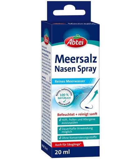 Anwendungsgebiet von Abtei Meersalz Nasen SprayAbtei Meersalz Nasen Spray: Natürlich wirksam für Erwachsene, Kinder und Säuglinge mit MeerwasserAbtei Meersalz Nasenspray befeuchtet und reinigt die Nase sanft:100% natürlichReines, isotonisiertes MeerwasserZur schonenden Reinigung des Nasenhöhle (z. B. bei Luftbelastung durch Pollen und Staub)Befeuchtung der Nasenschleimhaut (bei geringer Luftfeuchtigkeit, z. B. in klimatisierten Räumen)Dabei eignet sich das Nasenspray sowohl für Erwachsene, als auch für Kinder und Säuglinge ab 15 Tagen. Bei der Nasenpflege ohne Konservierungsstoffe stellt sich kein Gewöhnungseffekt ein.Wirkstoffe / Inhaltsstoffe / ZutatenAbtei Meersalz Nasen Spray enthält:100 % isotonische Meerwasser-Lösung (entsprechen 9 g/l NaCI). Steril und ohne Konservierungsstoffe.GegenanzeigenBei bekannter Überempfindlichkeit gegenüber einen der oben genannten Inhaltsstoffe sollte dieses Produkt nicht angewendet werden.DosierungAnwendungsempfehlung von Abtei Meersalz Nasen Spray: Ohne Einschränkung - kann täglich und so oft wie nötig verwendet werden. Die Beaufsichtigung durch Erwachsene wird für die Anwendung bei Kindern empfohlen.Entfernen Sie die Schutzkappe. Pumpen Sie vor dem ersten Gebrauch einige Male, bis ein gleichmäßiger Sprühnebel austritt. Führen Sie die Sprühdüse vorsichtig in ein Nasenloch ein und geben Sie bei aufrechter Haltung in jedes Nasenloch einen Sprühstoß ab. Bei Säuglingen, Oberkörper aufrichten. Lassen Sie das Produkt für einige Sekunden einwirken. Erwachsene und Kinder ab 2 Jahren: Anschließend bitte die Nase putzen.Waschen Sie die Sprühdüse nach jedem Gebrauch mit heißem Wasser und trocknen Sie diese gut ab. Aus hygienischen Gründen sollte die Sprühdüse nach jedem Gebrauch gereinigt werden. Nach der Anwendung die Schutzkappe wieder auf die Sprühdüse stecken. HinweiseMedizinprodukt.Für Erwachsene, Kinder und Säuglinge ab 15 Tagen.Kinder sollten das Produkt unter Aufsicht von Erwachsenen ...