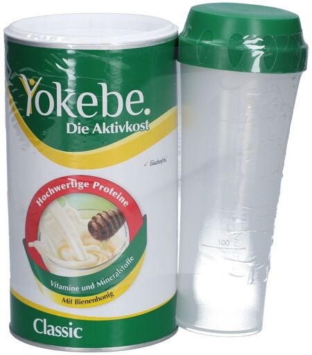 Bitte achten Sie auf eine abwechslungsreiche und ausgewogene Ernährung und gesunde Lebensweise. Der YOKEBE Classic Shake ist ein hochwertiger Mahlzeitersatz für eine gewichtskontrollierende Ernährung. Er enthält eine einzigartige Kombination aus hochwertigen Proteinen, Bienenhonig, Vitaminen, Mineralstoffen und Spurenelementen. Die enthaltenen Vitamine B5 und B12 tragen zu einem normalen Energiestoffwechsel bei, während Vitamin B6 den Protein- und Glykogenstoffwechsel unterstützt. Durch seine ausgewogene Nährstoffzusammensetzung fördert Yokebe den Erhalt der Muskelmasse während der Diät und hilft dem Körper, auf seine Fettreserven zurückzugreifen. YOKEBE Classic ist glutenfrei und für Vegetarier geeignet. Zutaten: SOJAproteinisolat (41,0 %), Honig (15,3 %), MagerMILCHpulver, MOLKENproteinkonzentrat (10,1 %), Maltodextrin, MILCHproteinkonzentrat (5,0 %), Maisdextrin, Kaliumphosphat, Magnesiumhydroxid, Trennmittel Siliciumdioxid, Vitamin C, Vitamin E, Eisenphosphat, Emulgator SOJA-Lecithin, Niacin, Zinkoxid, Antioxidationsmittel Alpha-Tocopherol, Mangansulfat, Calcium-D-Pantothenat, Thiamin (Vitamin B1), Vitamin B6, Vitamin A, Kupfercarbonat, Vitamin K, Natriumselenit, Folsäure, Vitamin D3. Nährwertangaben: Nährstoff Pro 100 g Energie 1611 kJ / 385 kcal Fett 7,3 g – davon gesättigte Fettsäuren 2,2 g Kohlenhydrate 33,6 g – davon Zucker 32,2 g Eiweiß 50,3 g Ballaststoffe 1,3 g Salz 1,3 g Verzehrempfehlung: Als Mahlzeitenersatz werden 5 gestrichene Messlöffel (40 g) YOKEBE Classic in 200 ml fettarme Milch (1,5 % Fett) eingerührt. Zusätzlich sollte 1/2 TL (1,5 g) Pflanzenöl mit hohem Anteil an ungesättigten Fettsäuren (z. B. Sonnenblumen- oder Traubenkernöl) hinzugefügt werden. Die Mischung gut umrühren oder im Shaker schütteln. Hinweise & Aufbewahrung: Eine ausgewogene Ernährung und ein gesunder Lebensstil sind wichtig. YOKEBE Classic sollte kühl, trocken und vor Licht geschützt gelagert werden. Die Yokebe-Diät funktioniert nur im Rahmen einer kalorienreduzierten Ernährung. Bitte beachten Sie die Hinweise auf der Verpackung. Nettofüllmenge: 500 g (ca. 12 Portionen) Hersteller: Naturwohl Pharma GmbH ...