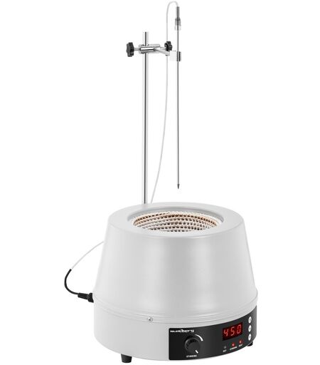Der Magnetrührer SBS-LHM-1000/DH ist dank des Heizmantels ideal für Rundkolben geeignet, die in Laboren häufig zum Verrühren von Flüssigkeiten verwendet werden. Die Form des Heizpilzes Labor umhüllt dabei den Rundkolben und überträgt die eingestellte Temperatur optimal auf die gesamte Flüssigkeit. Über eine digitale Anzeige lässt sich dabei die Temperatur punktgenau einstellen. Dadurch ist das Gerät auch zum Zubereiten von Liquids für E-Zigaretten besonders gut geeignet. Im Heizmantel des Magnetrührers finden runde Behälter mit einem Fassungsvermögen von bis zu 1000 ml Platz. Über das Bedienfeld wird mit einem Drehregler bequem die Rührgeschwindigkeit auf bis zu 1600 U/min eingestellt. Die Temperatur lässt sich mit Hilfe von Tasten und einem digitalen Display bis auf 450 °C exakt bestimmen. Der Heizpilz Labor zeichnet sich dabei durch eine schnelle Aufheizzeit aus. Dadurch können auch zähflüssige Substanzen zuverlässig vermischt werden. Der Labor Heizmantel sowie die Rührfunktion können unabhängig voneinander genutzt werden. Der Magnetrührer ist mit einem Stativ ausgestattet, das Sie bei Bedarf direkt an das Gehäuse anbringen können. In erster Linie ist es für den Temperaturfühler vorgesehen, mit dessen Hilfe Sie die Temperatur noch exakter kontrollieren können. Der Labor Heizpilz ist in einem pulverbeschichteten Gehäuse fest verbaut und bietet dank seiner Konstruktion aus Fiberglas einen sicheren Halt für Rundkolben aus Glas. Damit das Gerät auch bei hohen Rührgeschwindigkeiten sicher steht, ist es mit drei rutschfesten Gummifüßen ausgestattet. ...