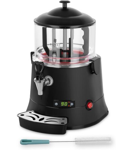 Der Kakaodispenser RCSS-5 ECO von Royal Catering zaubert im Handumdrehen eine zartflüssige, heiße Schokolade. Dank des speziellen Paddelsystems wird die Trinkschokolade konstant gerührt und bleibt somit klumpenfrei und wunderbar flüssig. Das Gerät eignet sich ebenfalls ideal zum Warmhalten von Glühwein, Tee oder anderen Heißgetränken. Ob heiße Milch, Kaffee oder Glühbier – dieser Getränkespender ist vielseitig einsetzbar und bereichert Ihren Gastronomiebedarf in der Kantine, im Restaurant oder bei Buffets. Die Maschine ist nur für flüssige Schokolade geeignet. Bitte schmelzen Sie die Schokolade, bevor Sie sie in den Dispenser geben. Mit dem Kakaodispenser halten Sie in einer 5 Liter Fassungskuppel Ihre Getränke bei richtiger Temperatur warm. Das professionelle und zeitlose Design macht das Gerät zu einem modischen Hingucker für jede Bar, jedes Buffett und jedes Restaurant. Im transparenten Behälter lässt sich die Trinkschokolade ansprechend für das Auge präsentieren. Dieser ist durch einen Verschluss sicher und fest am Gehäuse des Kakaodispenser befestigt. Beim Säubern lässt sich der Behälter einfach abnehmen. Durch ein digitales Kontrollsystem mit Touchpad Design lässt sich der Kakaodispenser angenehm und leicht bedienen. Über wenige Knöpfe können die Temperatur, das Rührwerk und das Erwärmen kontrolliert werden. Das moderne, benutzerfreundliche LED-Display informiert den Nutzer, ob das Gerät an oder aus geschaltet ist und zeigt die Vorgänge an. Der ON/OFF Schalter befindet sich separat an der Seite des Geräts. Ein Überhitzungsschutz sorgt dafür, dass der Getränkespender nicht zu heiß läuft. Der Kakaodispenser arbeitet mit einer Gesamtleistung von 440 Watt und ist besonders ökonomisch und kosteneffizient. Dies wird durch die energiesparende Bauart gewährleistet, welche den Stromverbrauch reduziert und die Lebensdauer einzelner Bestandteile des Geräts verlängert – für die Anwendung heißt das: erhöhte Betriebszeit bei weniger Stromkosten! Die Heavy-Duty Maschine hat einen Arbeitszyklus von 8 bis 12 Stunden. Eine gute Trinkschokolade muss dickflüssig und zart sein, das meistert der Kakaodispenser von Royal Catering. Dank der Option des dauerhaften Warmhaltens müssen Sie sich keine Sorgen machen, die Schokolade könnte abkühlen. Das Paddelsystem sorgt dafür, dass die Schokolade dauerhaft gerührt wird und so zartflüssig bleibt – für ein einmaliges Kundenerlebnis. Der transparente Getränkebehälter aus BPA-freiem Polycarbonat ist gesundheitsunbedenklich, äußerst solide und hält extremen Temperaturen stand. Der Zapfhahn sorgt dafür, dass die Schokolade kontrolliert abgezapft werden kann, ohne Inhalt zu verschütten. Geschützt vor Schmutz wird die Schokolade von einem leichten, widerstandsfähigen Deckel auf dem Behälter. Eine Abtropfschale fängt überschüssige Flüssigkeiten auf und sorgt für einen sauberen Arbeitsplatz. Diese kann bei Bedarf entnommen und einfach gesäubert werden. Das Gehäuse steht auf gummierten Füßen, sodass es Oberflächen vor Kratzern... ...