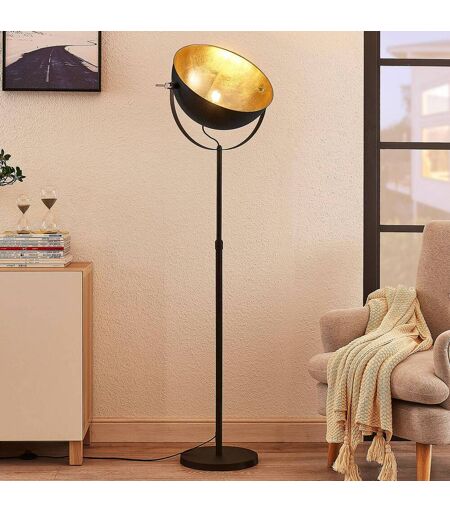Der Schirm der matt-schwarzen Stehleuchte Muriel in Form einer Halbkugel wurde innen golden foliert, was zu einer warmen und behaglichen Lichtwirkung beiträgt. ...