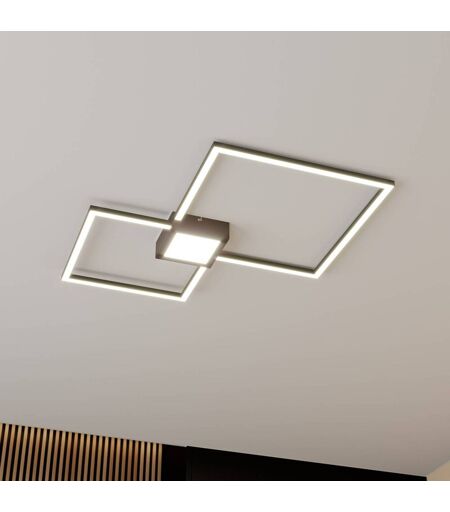 Quadratische Formen kennzeichnen die LED-Deckenleuchte Duetto. Zwei schmale, quadratische Rahmen beherbergen die warmweißen LEDs, die von einer gefrosteten Abdeckung aus Acryl abgeblendet werden. Über den Wand-Lichtschalter kann die Helligkeit des Lichts durch mehrmalige Betätigung in drei Helligkeitsstufen eingestellt werden. ...