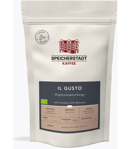 g, beschert den Liebhabern ein unvergessliches Genusserlebnis. Durch den hohen Anteil an Robustabohnen erhält man bei idealer Zubereitung der Speicherstadt Il Gusto Espressomischung Bio eine luftige, haselnussbraune und stabile Crema. Speicherstadt Kaffees sind jetzt auch frisch gemahlen erhältlich! ...
