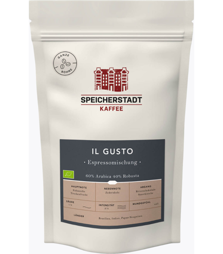 g, beschert den Liebhabern ein unvergessliches Genusserlebnis. Durch den hohen Anteil an Robustabohnen erhält man bei idealer Zubereitung der Speicherstadt Il Gusto Espressomischung Bio eine luftige, haselnussbraune und stabile Crema. Speicherstadt Kaffees sind jetzt auch frisch gemahlen erhältlich! ...