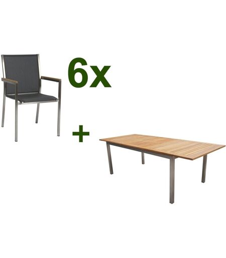 STERN Polaris Garten-Essgruppe, silbergrau, Edelstahl/Teak, Tisch 200/300 x 100 cm, 6 Stapelsessel, FSC®-zertifiziertes Produkt