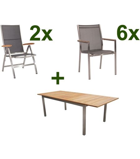 STERN Cardiff Garten-Essgruppe, silber/silbergrau, Edelstahl/Teak, Tisch 200/300 x 100 cm, 6 Stapel-, 2 Klappstühle, FSC®-zertifiziertes Produkt