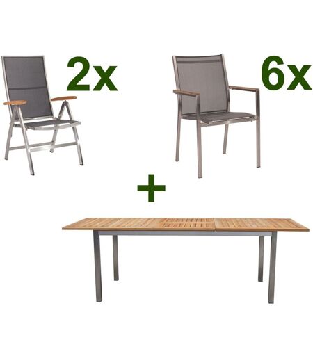 STERN Cardiff Garten-Essgruppe, silber/silbergrau, Edelstahl/Teak, Tisch 180/240 x 100 cm, 6 Stapel-, 2 Klappstühle, FSC®-zertifiziertes Produkt