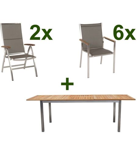 STERN Cardiff Garten-Essgruppe, silber/taupe, Edelstahl/Teak, Tisch 180/240 x 100 cm, 6 Stapel-, 2 Klappstühle, FSC®-zertifiziertes Produkt