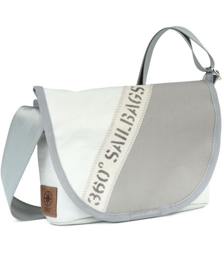 360° Taschen Perle Umhängetasche weiß / Persenning grau, Stencil Aufschrift, Gurt grau