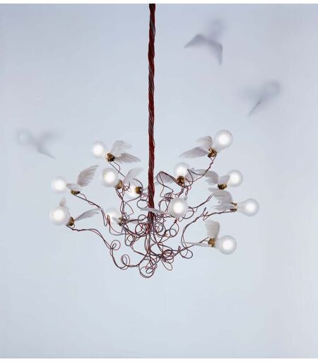 Wie ein Schwarm Vögel kommt einem die Komposition der Ingo Maurer Birdie LED Pendelleuchte mit Ihren 12 Armen vor. Die Birdie Serie wurde 2002 entworfen und geniest seitdem einen stetig wachsenden Bekanntheitsgrad, nun ist sie auch mit neuster LED-Technolgie erhältlich. Nicht zuletzt am hohen Wiedererkennungswert liegt der stetig wachsende Bekanntheitsgrad der kleinen Birdies, denn an jeder Leuchtmittelfassung befinden sich handgefertigte Flügel aus Gänsefedern welche der Birdies Serie Ihren Namen und ihr einzigartiges Aussehen verschaffen. Befestigt ist jede Fassung an einem dünnen Drahtarm, welcher serparat frei nach Lust und Laune gebogen werden kann - so ist der Fantasie bei der Ausrichtung der Ingo Maurer Birdie LED Pendelleuchte kaum Grenzen gesetzt und Sie können jede Leuchte ganz nach Lust und Geschmack anordnen. Die Kabel sind dabei im Kontrast dazu rot oder im kl... ...