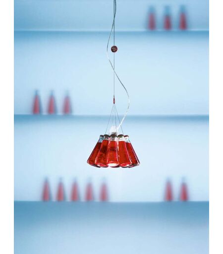 Die Ingo Maurer Campari Light Pendelleuchte beweist, dass einfache Ideen gekonnt in eine extravagante Leuchte umgesetzt werden können. So wird sie aus 10 originalen Campari Flaschen hergestellt. Diese werden einfach in die Konstruktion eingehängt und können somit auch einfach zum reinigen oder für den Umzug abgenommen werden. Sie formen den Schirm der Leuchte, in dessen Mitte sich das Leuchtmittel verbirgt. Das Licht strahlt nach unten direkt und durch das farbige Glas der Flaschen diffus und getönt in den Raum. Aber dem nicht genug: über einen Campari-Kronkorken lässt sich die Ingo Maurer Campari Light Pendelleuchte auch noch stufenlos in der Höhe verstellen. Die Ingo Maurer Campari Light Pendelleuchte hat eine klassische E27 Fassung und ist daher (abhängig vom Leuchtmittel) auch problemlos extern dimmbar. Die Ingo Maurer Campari Light Pendelleuchte erhalten Sie in zwei Varianten mit un... ...