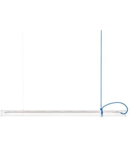 Die Ingo Maurer Tubular Pendelleuchte ist eine multifunktionale Glasleuchte von Designer Sebastian Hepting. Das Glasrohr kann um 360° gedreht werden und ist somit als Downlight, Uplight oder Wallwasher einsetzbar. Die vielseitige Tubular ist mit ihrer Länge von 125 cm besonders gut für breite Flächen geeignet – von Schriebtisch, Konferenztisch bis zur Bürobeleuchtung. Tubular besteht aus einem filigranen Glasrohr, das einen Diffusor mit Lamellen umhüllt. Die LED-Leuchte hängt waagerecht, getragen von einem fast unsichtbaren Draht an der einen Seite, und von einem farbigen, Textilkabel an der anderen Seite, das lässig um das Rohr gewickelt ist. Minimalistisch und verspielt setzt die Tubular Pendelleuchte mit roter Lamelle und rotem Kabel oder mit weißer Lamelle und blauem Kabel einen kleinen Farbtupfer. Andersfarbige Kabel können von Fachleuten angeschlossen werden. Der Transformator befi... ...