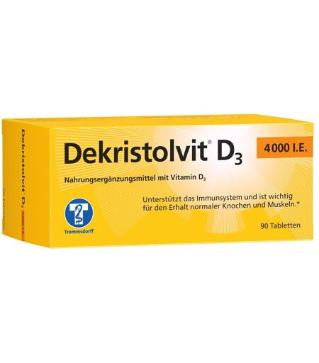 Nahrungsergänzungsmittel sind kein Ersatz für eine abwechslungsreiche und ausgewogene Ernährung und eine gesunde Lebensweise. Dekristolvit® D3 4.000 I.E. Tabletten für Ihre Vitamin D-Versorgung Vitamin D-Unterversorgung vermeiden mit Dekristolvit® D3 4.000 I.E. Tabletten Vitamin D hat Einfluss auf zahlreiche Abläufe im Körper: Das Vitamin mit Schlüsselfunktion wirkt regulierend auf das Immunsystem, sorgt für starke Knochen und gesunde Zähne, unterstützt die Muskelarbeit und ist beteiligt an der Zellteilung. Ein Großteil der Deutschen jedoch ist nicht ausreichend mit Vitamin D versorgt, die Unterversorgung erstreckt sich über alle Altersklassen. Dekristolvit® D3 4.000 I.E. Tabletten unterstützen wirksam das Immunsystem, Knochen und Muskulatur. Durch Vitamin D wird die Aufnahme von Calcium, das für viele Körperfunktionen benötigt wird, deutlich verbessert. Frei von Gluten, Laktose, Fructose und Gelatine sind sie sehr gut verträglich. Dekristolvit® D3 4.000 I.E. Tabletten – für ausreichend Vitamin D im Blut Dosierung ab 1 Tablette täglich für eine ausreichende Versorgung Für Kinder ab 11 Jahren, Jugendliche und Erwachsene In Deutschland hergestellt und entwickelt Hinweise auf eine Unterversorgung mit Vitamin D Mögliche Anzeichen einer Unterversorgung können Muskelkrämpfe und -schmerzen sowie eine höhere Infektanfälligkeit sein. Dekristolvit® D3 4.000 I.E. Tabletten können helfen, den täglichen Bedarf an Vitamin D zu decken. Zutaten: Füllstoff: Mannit, Cellulose; Trennmittel: Magnesiumsalze der Speisefettsäuren, Cholecalciferol. Zusammensetzung pro Tablette % NRV Vitamin D3 100 µg (= 4000 I.E.) 2.000 % Verzehrempfehlung: Erwachsene und Kinder ab 11 Jahren nehmen täglich 1 Tablette mit reichlich Flüssigkeit zu einer Mahlzeit ein. Hinweis: Die angegebene empfohlene Tagesmenge darf nicht überschritten werden. Aufbewahrung: Kühl (6-25 °C) und lichtgeschützt lagern. Außerhalb der Reichweite von kleinen Kindern aufbewahren. Nettofüllmenge: 90 Tabletten Hersteller: Mibe GmbH Arzneimittel Münchener Straße 15 06796 Brehna ...