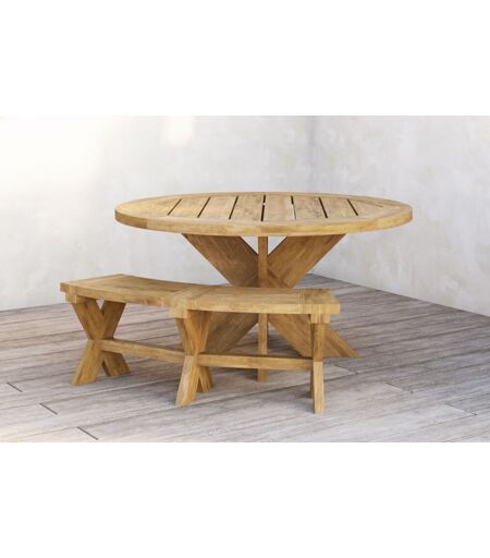 OUTFLEXX Quantum Garten-Essgruppe, recyceltes Teak, Tisch Ø150 cm, 1 Bank 175x30 cm, Langlebig, FSC®-zertifiziertes Produkt