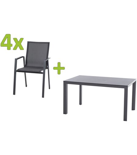 SIENA GARDEN Silva/Reno Garten-Essgruppe, matt anthrazit/ferro, Aluminium/Ranotex-Gewebe/HPL, Tisch 160x90 cm, 4x Stapelsessel. Wetterfrest