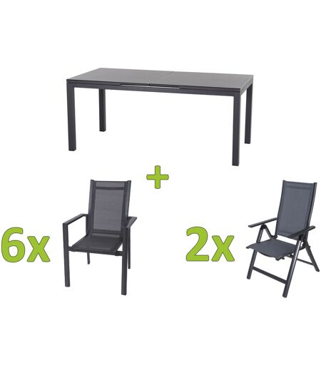 SIENA GARDEN Miros Garten-Essgruppe, anthrazit/dark concrete, Aluminium/Glas, Tisch 180/240x90 cm, 2x Klappstühle, 6x Stapelsessel