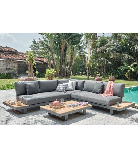 Artikelnummer:22366 OUTFLEXX® Ecklounge aus Aluminium in anthrazit und Teak Holz inkl. Loungetisch sowie Polster in grau, mit Platz für 5 Personen . Aluminium und Teak Holz - eine perfekte Kombination Warum sollten Sie es zu Hause im Grünen nicht auch bequem haben? Holen Sie sich Komfort und Stil doch einfach in Ihren eigenen Garten. Sie wissen nicht wie? Dann lassen Sie sich von unseren ausgesuchten Gartenmöbeln inspirieren. Wie wäre es z.B. mit dieser Ecklounge von OUTFLEXX® - Ein perfekter Mix verschiedener Materialien. Der rustikale und natürliche Holzlook dieser Lounge fügt sich perfekt in jeden Garten ein und sorgt für ausreichend Stabilität. Auch wenn Sie Freunde und Familie zu Besuch haben, bietet diese Lounge genügend Platz für Ihre Gäste. Machen Sie es sich doch einfach mal wieder mit einem leckeren Kaltgetränk gemeinsam bequem. Der dazugehörige Tisch eignet sich ideal für die Kaffee- oder Teetassen, während Sie gemütlich zusammen den nächsten Krimi lesen. So oder so ähnlich könnten die nächsten Sommerabende ab sofort bei Ihnen zu Hause in Ihrem Garten aussehen. Rost ist nun ein Fremdwort - Das Gestell der Lounge in antrhazit wird aus pulverbeschichtetem und rostfreiem Aluminium gefertigt. Wetterumschwünge und Regen machen diesem Gestell nichts aus. Rost hat keine Chance. Dieses im Trend liegende Material ist leicht, robust und stabil. Es ist pflegeleicht, wetterfest und ganzjährig für den Außeneinsatz geeignet. Kein Wunder also, dass viele der hergestellten Gartenmöbel inzwischen mit Aluminium verarbeitet werden. Bequeme Polster und abnehmbare Bezüge - Bitte nehmen Sie Platz. Bequem und komfortabel überzeugen die Polster dieser Lounge garantiert auch Sie. Die Bezüge der Polster aus 100% Polyester in der Farbe royal stone grey sind angenehm auf der Haut und der verwendete Schaumstoff für die Polsterfüllung lässt Sie auch an langen Abenden nicht im Stich. Alle Bezüge haben einen verdeckten Reißverschluss und können problemlos abgenommen und gewaschen werden. Ein verschütteter Drink oder eine über Bord gegangene Eiskugel brauchen Ihnen ab sofort also keine Sorgen mehr machen. Gute Planung ist die halbe Miete, deshalb haben wir für Sie die wichtigsten Maße zusammengestellt: 2-Sitzer: ca. 82 x 211,5 x 69 cm Eckelement: ca. 82 x 106 x 69 cm Tisch: ca. 95 x 130 x 25 cm Stellmaß der Ecklounge: Schenkelmaße außen: ca. 310 x 310 cm Schenkelmaße innen: ca. 211,5 x 211,5 cm Worauf warten Sie also noch? Greifen Sie zu und verpassen Sie Ihrem Garten ein Update. Ihre Vorteile - FSC verifiziertes Teak Holz Das hier verwendete Teak Holz überzeugt wie kaum ein anderes Holz von Natur aus mit einer hohen Witterungsbeständigkeit und Haltbarkeit. - Rostfreie Aluminiumkonstruktion Das für das Gestell verwendete rostfreie Aluminium ist ganzjährig für den Außeneinsatz geeignet und überzeugt durch seine Langlebigkeit. - Abnehmbare Bezüge Die Polsterbezüge verfügen über einen verdeckten Reißverschluss und können problemlos abgenommen und bei 30°C gewaschen... ...