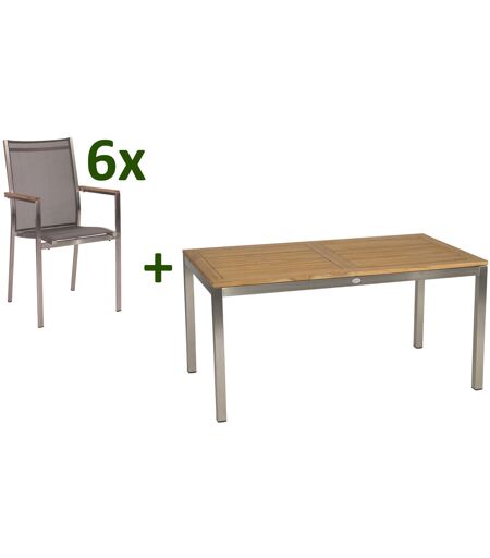 STERN Cardiff Esstischgruppe, silber/silbergrau, Edelstahl/Textilen/Teakholz, Ausziehtisch 162/220 x 90 cm, 6 Stapelsessel . Sie lieben es gemütliche Grillabende mit Freunden und Familie zu verbringen und sind auf der Suche nach einer flexiblen und zugleich schönen Esstischgarnitur? Dann sollten Sie sich diese Kombination aus edlem Edelstahl und Teak von Stern genauer ansehen. Der Hersteller setzt dabei, neben dem minimalistischen Design, vor allem auf besonders hochwertige Materialien. Diese sind dabei ebenso robust wie edel. Das beginnt schon beim stabilen Rahmen: Durch den Einsatz von Edelstahl kann nicht nur die Optik überzeugen, sondern auch die hohe Robustheit. Der Gartentisch bietet mit seinen Maßen von ca. 162/220 x 90 cm bei einer Höhe von ca. 75 cm ausreichend Platz, um gemeinsam schöne Stunden bei einem Brunch im Garten zu verbringen. Das Gestell aus Edelstahl der Güteklasse 304 gibt dem Tisch mit seinen ca. 5 x 5 cm starken Tischbeinen eine besonders hohe Stabilität. Die Tischplatte besteht aus Teakholz und lässt sich durch einen geschmeidigen Butterfly-Auszug problemlos von ca. 162 cm auf ca. 220 cm verlängern, sodass Sie zahlreiche Plätze für Gäste schaffen. Die hochwertige Materialauswahl und die sorgfältige Verarbeitung sorgen nicht nur für die exklusive Optik dieses Ausziehtisches, sondern machen den Tisch auch sehr stabil. Genießen Sie mit gutem Gewissen entspannte Stunden im Garten - Das für diesen Tisch verwendete Teakholz stammt damit aus verantwortungsvoll bewirtschafteten Quellen. Der Cardiff überzeugt nicht nur mit seinem zeitlosen Design und den hochwertigen Materialien, sondern vor allem auch durch seinen Komfort und seine Funktionalität. Schlicht, unauffällig und dennoch ein Hingucker. So lässt sich der Cardiff wohl am besten beschreiben. Holen Sie sich mit diesem Stapelsessel Eleganz vereint mit perfektem Sitzkomfort nach Hause und genießen Sie entspannte Stunden z.B. nach Ihrem Feierabend. Die hochwertigen Materialien und die sorgfältige Verarbeitung sorgen nicht nur für die besondere Optik dieses Stuhls, sondern machen ihn mit einer Belastbarkeit von ca. 120 kg zudem sehr stabil. Der Cardiff wird Ihnen durch seine hohe Widerstandsfähigkeit gegen Wind und Wetter viele Jahre Freude bereiten. Das verwendete Edelstahl der Güteklasse 304 ist rostfrei und ebenso wie das Textilgewebe der Sitzfläche und Rückenlehne besonders pflegeleicht. Leichte Verschmutzungen lassen sich ganz einfach mit ein wenig Wasser wieder entfernen. Das für die Armlehnen verwendete Teakholz stammt damit aus verantwortungsvollen Quellen. So können Sie sich guten Gewissens zurücklehnen und sich so richtig entspannen. Durch seine Stapelfunktion und den Maßen von ca. 62 x 57 x 92 cm lässt sich der Stuhl aber dennoch platzsparend verstauen, wenn Sie doch einmal etwas mehr Platz auf Ihrer Terrasse oder im Garten benötigen sollten. Diese Garnitur wird Ihnen aufgrund der strapazierfähigen Materialien und der hochwertigen Verarbeitung ein langlebiger... ...
