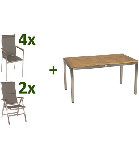 STERN Cardiff Esstischgruppe, silber/taupe, Edelstahl/Textilen/Teakholz, Ausziehtisch 162/220 x 90 cm, 4 Stapelsessel, 2 Multipositionssessel . Sie lieben es gemütliche Grillabende mit Freunden und Familie zu verbringen und sind auf der Suche nach einer flexiblen und zugleich schönen Esstischgarnitur? Dann sollten Sie sich diese Kombination aus edlem Edelstahl und Teak von Stern genauer ansehen. Der Hersteller setzt dabei, neben dem minimalistischen Design, vor allem auf besonders hochwertige Materialien. Diese sind dabei ebenso robust wie edel. Das beginnt schon beim stabilen Rahmen: Durch den Einsatz von Edelstahl kann nicht nur die Optik überzeugen, sondern auch die hohe Robustheit. Der Gartentisch bietet mit seinen Maßen von ca. 162/220 x 90 cm bei einer Höhe von ca. 75 cm ausreichend Platz, um gemeinsam schöne Stunden bei einem Brunch im Garten zu verbringen. Das Gestell aus Edelstahl der Güteklasse 304 gibt dem Tisch mit seinen ca. 5 x 5 cm starken Tischbeinen eine besonders hohe Stabilität. Die Tischplatte besteht aus Teakholz und lässt sich durch einen geschmeidigen Butterfly-Auszug problemlos von ca. 162 cm auf ca. 220 cm verlängern, sodass Sie zahlreiche Plätze für Gäste schaffen. Die hochwertige Materialauswahl und die sorgfältige Verarbeitung sorgen nicht nur für die exklusive Optik dieses Ausziehtisches, sondern machen den Tisch auch sehr stabil. Genießen Sie mit gutem Gewissen entspannte Stunden im Garten - Das für diesen Tisch verwendete Teakholz stammt damit aus verantwortungsvoll bewirtschafteten Quellen. Die Sessel überzeugen nicht nur mit Ihrem zeitlosen Design und den hochwertigen Materialien, sondern vor allem auch durch Ihren Komfort und Ihre Funktionalität. Schlicht, unauffällig und dennoch ein Hingucker. So lassen sich die Cardiff Sessel wohl am besten beschreiben. Holen Sie sich mit diesen Sesseln Eleganz vereint mit perfektem Sitzkomfort nach Hause und genießen Sie entspannte Stunden z.B. nach Ihrem Feierabend. Die hochwertigen Materialien und die sorgfältige Verarbeitung sorgen nicht nur für die besondere Optik dieser Stühle, sondern machen sie auch äußerst stabil. Die Cardiff Stühle werden Ihnen durch ihre hohe Widerstandsfähigkeit gegen Wind und Wetter viele Jahre Freude bereiten. Das verwendete Edelstahl der Güteklasse 304 ist rostfrei und ebenso wie das Textilgewebe der Sitzfläche und Rückenlehne besonders pflegeleicht. Die Sitzfläche hat bei beiden Sesseln die Farbe taupe. Leichte Verschmutzungen lassen sich ganz einfach mit ein wenig Wasser wieder entfernen. Das für die Armlehnen verwendete Teakholz stammt damit aus verantwortungsvollen Quellen. So können Sie sich guten Gewissens zurücklehnen und sich so richtig entspannen. Durch seine Stapelfunktion und den Maßen von ca. 61 x 57 x 92 cm lässt sich der Stapelstuhl platzsparend verstauen, wenn Sie doch einmal etwas mehr Platz auf Ihrer Terrasse oder im Garten benötigen sollten. Der Multipositionssessel lässt sich durch seine Klappfunktion und den Maßen von ca. 69 x... ...