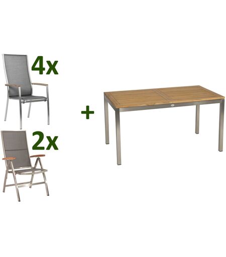 STERN Cardiff Garten-Essgruppe, silber/silbergrau, Edelstahl/Textilen/Teakholz, 162/220 x 90 cm, 4 Stapel-, 2 Klappstühle, Butterfly-Auszug