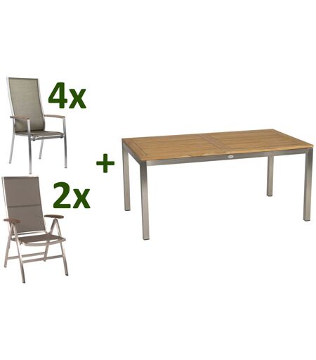 STERN Cardiff Garten-Essgruppe, silber/taupe, Edelstahl/Textilen/Teakholz, 162/220 x 90 cm, 4 Stapel-, 2 Klappstühle, Butterfly-Auszug