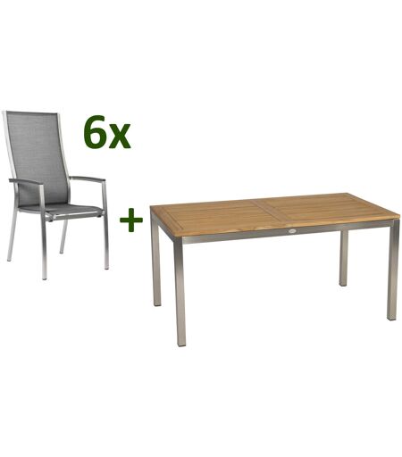 STERN Cardiff Garten-Essgruppe, silber/silbergrau, Edelstahl/Textilen/Teakholz/Alu, 162/220 x 90 cm, 6 Stapelsessel, Butterfly-Auszug