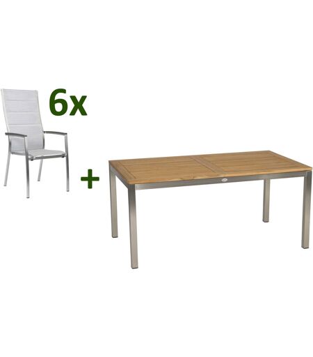 STERN Cardiff Esstischgruppe, silber, Edelstahl/Textil/Teakholz, Ausziehtisch 162/220 x 90 cm, 6 Stapelsessel . Sie lieben es gemütliche Grillabende mit Freunden und Familie zu verbringen und sind auf der Suche nach einer flexiblen und zugleich schönen Esstischgarnitur? Dann sollten Sie sich diese Kombination aus edlem Edelstahl und Teak von Stern genauer ansehen. Der Hersteller setzt dabei, neben dem minimalistischen Design, vor allem auf besonders hochwertige Materialien. Diese sind dabei ebenso robust wie edel. Das beginnt schon beim stabilen Rahmen: Durch den Einsatz von Edelstahl kann nicht nur die Optik überzeugen, sondern auch die hohe Robustheit. Der Gartentisch bietet mit seinen Maßen von ca. 162/220 x 90 cm bei einer Höhe von ca. 75 cm ausreichend Platz, um gemeinsam schöne Stunden bei einem Brunch im Garten zu verbringen. Das Gestell aus Edelstahl der Güteklasse 304 gibt dem Tisch mit seinen ca. 5 x 5 cm starken Tischbeinen eine besonders hohe Stabilität. Die Tischplatte besteht aus Teakholz und lässt sich durch einen geschmeidigen Butterfly-Auszug problemlos von ca. 162 cm auf ca. 220 cm verlängern, sodass Sie zahlreiche Plätze für Gäste schaffen. Die hochwertige Materialauswahl und die sorgfältige Verarbeitung sorgen nicht nur für die exklusive Optik dieses Ausziehtisches, sondern machen den Tisch auch sehr stabil. Genießen Sie mit gutem Gewissen entspannte Stunden im Garten - Das für diesen Tisch verwendete Teakholz stammt damit aus verantwortungsvoll bewirtschafteten Quellen. Die dazu passend kombinierten Sessel überzeugen nicht nur mit dem zeitlosen Design und den hochwertigen Materialien, sondern vor allem auch durch den Komfort und die Funktionalität. Schlicht, unauffällig und dennoch ein Hingucker. So lässt sich der Cardiff Multipositionssessel wohl am besten beschreiben. Die hochwertigen Materialien und die sorgfältige Verarbeitung sorgen nicht nur für die besondere Optik der Stühle, sondern machen zudem sehr stabil. Der Cardiff wird Ihnen durch seine hohe Widerstandsfähigkeit gegen Wind und Wetter viele Jahre Freude bereiten. Das verwendete Edelstahl der Güteklasse 304 ist rostfrei und ebenso wie das Textilgewebe der Sitzfläche und Rückenlehne besonders pflegeleicht. Die Sitzfläche hat die Farbe silber und ist gepolstert und die Rückenlehne ist extra hoch, was für zusätzlichen Komfort sorgt. Leichte Verschmutzungen lassen sich ganz einfach mit ein wenig Wasser wieder entfernen. Die Armlehnen wurden aus Aluminium gefertigt und besitzen die Farbe anthrazit. So können Sie sich guten Gewissens zurücklehnen und sich so richtig entspannen. Durch seine Stapelfunktion und den Maßen von ca. 68,5 x 56 x 110 cm lässt sich der Stuhl aber dennoch platzsparend verstauen, wenn Sie doch einmal etwas mehr Platz auf Ihrer Terrasse oder im Garten benötigen sollten.. Diese Garnitur wird Ihnen aufgrund der strapazierfähigen Materialien und der hochwertigen Verarbeitung ein langlebiger Begleiter im Garten sein, der Ihnen viele Sommer Freude... ...