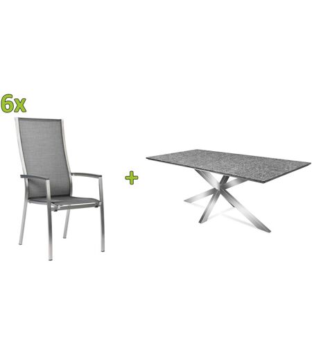 STERN Garten-Essgruppe, silbergrau/grau, Edelstahl/Textilene, Tisch 200 x 100 cm, 6 Stapelsessel, hohe Rückenlehne