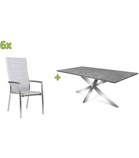 STERN Garten-Essgruppe, silber/grau, Edelstahl/Textilene, Tisch 200 x 100 cm, 6 Stapelsessel, hohe Rückenlehne, padded