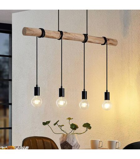 Hängelampe Ferris Lindby, dimmbar, Holz hell, für Wohn- / Esszimmer, Metall, Vintage, Pendelleuchte