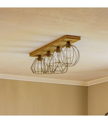 Die vierflammige Deckenleuchte Various ist mit Käfigschirmen aus schwarzen Metallstreben ausgestattet. Diese sind unterhalb eines rechteckigen Baldachins aus dunkel gebeiztem Kiefernholz angebracht. - in Europa gefertigt - Lieferung in nachhaltiger Verpackung ...