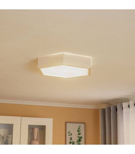 Mit ihrer sechseckigen Form und der Fertigung aus natürlichem Pinienholz stellt die Deckenleuchte Hagen einen besonderen Blickfang dar. Durch die satinierte Glasscheibe wird das Licht sanft entblendet und gleichmäßig in den Raum gestrahlt. ...