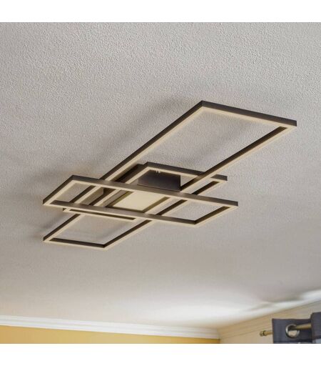 Die LED-Deckenleuchte Ismera setzt sich aus drei rechteckigen Rahmen zusammen. Der Kleinste wurde in Querrichtung, die beiden Großen in Längsrichtung am Baldachin befestigt. Nach unten gerichtet wurden in allen drei Elementen und auch im Baldachin LEDs hinter satinierten Abdeckungen verbaut, die sich per mitgelieferter Fernbedienung in der Lichtfarbe einstellen und auch dimmen lassen. - Lichtfarbe einstellbar von 3.000 K bis 6.500 K ...