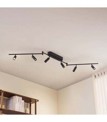 Die LED-Deckenlampe Eldrin kombiniert modernes Design mit hoher Funktionalität. Gefertigt aus robusten Materialien, fügt sich die schwarze Oberfläche harmonisch in zeitgemäße Wohnkonzepte ein. Die sechs individuell schwenkbaren Spots ermöglichen eine präzise Ausrichtung des Lichts, wodurch eine optimale Beleuchtung in Wohn- oder Flurbereichen geschaffen wird. Mit ihrem warmweißen Licht sorgt sie für eine angenehme und einladende Atmosphäre. Ausgestattet mit fest verbauten LEDs und einer hohen Farbwiedergabe von 90 Ra, liefert die Leuchte eine klare und natürliche Lichtqualität. Die energieeffiziente LED-Technologie reduziert den Stromverbrauch und bietet gleichzeitig eine langlebige Lichtquelle. Die Kombination aus Flexibilität, hochwertiger Verarbeitung und ansprechender Optik macht diese Deckenleuchte zu einer idealen Wahl für vielseitige Beleuchtungskonzepte. ...