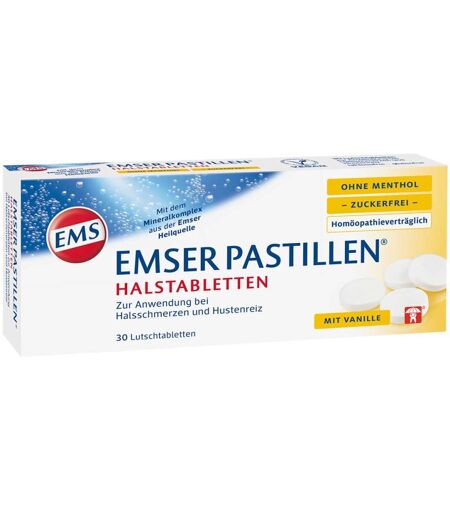 Anwendungsgebiet von Emser Pastillen ohne Menthol zuckerfreiEmser Pastillen ohne Menthol zuckerfrei werden traditionell angewendet, um Reizerscheinungen der Rachenschleimhaut zu mildern und die Schleimlösung im Bereich des Rachens zu unterstützen. Auch bei einer durch langes Sprechen oder Singen beanspruchten Stimme helfen Emser Pastillen ohne Menthol zuckerfrei die gereizten Stimmbänder wieder zu beruhigen. Wenden Sie Emser Pastillen ohne Menthol zuckerfrei vorbeugend an, wenn sich bereits mit einem Kratzen im Hals eine Erkältung bemerkbar macht. Wirkungsweise von Emser Pastillen ohne Menthol zuckerfreiEmser Pastillen ohne Menthol zuckerfrei befeuchten bei Halsschmerzen, Heiserkeit oder Hustenreiz die Rachenschleimhaut und mindern somit Ihre Beschwerden.Wirkstoffe / Inhaltsstoffe / Zutaten126 mg Emser Salz, natürlichCalcium stearat Hilfstoff (+)0.63 µg Iodid Ion Hilfstoff (+)Isomalt Hilfstoff (+)40 mg Natrium Ion Hilfstoff (+)Sucralose Hilfstoff (+)Bourbon-Vanille Pulver Hilfstoff (+)Vanille Aroma Hilfstoff (+)GegenanzeigenSehr selten können Magenbeschwerden und Blähungen auftreten. Bei bekannter Überempfindlichkeit gegenüber einem der oben genannten Inhaltsstoffe sollte Emser Pastillen ohne Menthol nicht angewendet werden. DosierungSoweit nicht anders verordnet, lutschen Sie bei ersten Anzeichen, wie z.B. Kratzen im Hals, 1-2 Emser Pastillen ohne Menthol zuckerfrei, oder lassen Sie diese langsam im Mund zergehen. Die maximale Tagesdosis von 6 Emser Pastillen ohne Menthol zuckerfrei sollte nicht überschritten werden. Kinder bis 6 Jahre können bis zu 4x täglich 1 Emser Pastillen ohne Menthol erhalten und lutschen. Emser Pastillen ohne Menthol zuckerfrei können in Ihrer Versandapotheke www.juvalis.de erworben werden. ...