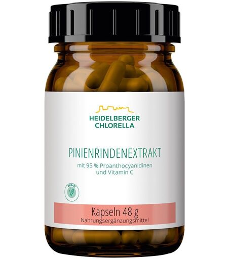 Nahrungsergänzungsmittel sind kein Ersatz für eine ausgewogene und abwechslungsreiche Ernährung und eine gesunde Lebensweise.Heidelberger Chlorella® Pinienrindenextrakt KapselnZutaten: Proanthocyanidinreicher Pinienrindenextrakt, Hydroxypropylmethylcellulose (Kapselhülle), Calciumascorbat/-threonat (Ester-C®) AusgewählteInhaltsstoffepro 3 Kapseln à 400 mg% RM *Pinienrindenextrakt870 mg davon Proanthocyanidine (95 %)826,5 mg Vitamin C24 mg30(als Calciumascorbat/-threonat (Ester-C®)(30 mg) *Referenzmenge für die tägliche ZufuhrVerzehrempfehlung:3 x täglich 1 Kapsel oder nach Empfehlung eines Therapeuten.Hinweis:Die angegebene empfohlene Tagesmenge darf nicht überschritten werden.Aufbewahrung: Kühl (6-25 °C) und lichtgeschützt lagern. Außerhalb der Reichweite von kleinen Kindern aufbewahren.Nettofüllmenge:120 Kapseln = 48 gHersteller:Heidelberger Chlorella GmbHIn der Heidelslach 469181 Leimen/St. Ilgen ...
