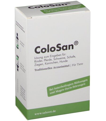 Arzneimittel zur Behandlung bei futterbedingten Blähungen und Magen-Darm-Störungen bei Tieren Vor allem bei Kälbern, die nach der Milchtränke gebläht“ sind, führt ColoSan® schnell zum Erfolg. Dabei ist es sehr gut verträglich und die Tiere sind schnell wieder fit.Bei Muttersauen wirkt ColoSan® gegen Verstopfung und kann MMA vorbeugen. In einer Studie erhielten die Tiere der Versuchsgruppe 2 – 3 Tage vor dem errechneten Geburtstermin ColoSan® verabreicht.Die spezielle Zusammenstellung und aufwendige Verarbeitung verschiedener ätherischer Öle führt zu einem einmaligen natürlichen Tierarzneimittel. Die wirksame Rezeptur ist unverändert seit über 50 Jahren am Markt und bei Landwirten gut bekannt und sehr geschätzt. Die enthaltene Kombination aus Kümmel-, Fenchel- und Anisöl hat eine beruhigende und entkrampfende Wirkung auf den Magen-Darm-Bereich.Ein großer Vorteil von ColoSan® ist, dass dieses Tierarzneimittel keine Wartezeit auf Milch und Fleisch hat.DosierungsanleitungEinzeldosis: Gewichtsklasse Dosis in ml / 10 kg Dosis in mg / kg Beispiele < 10 kg 3 ml / 10 kg 300 mg / kg Lamm, 5 kg: 1,5 ml 10 - 100 kg 1 ml / 10 kg 100 mg / kg Kalb, Schaf, Ziege, 50 kg: 5,0 ml 100 - 600 kg 0,3 ml / 10 kg 30 mg / kg Kuh, 600 kg: 18 ml Geben Sie ColoSan® unverdünnt seitlich in die Backentasche. Nötigenfalls kann die Anwendung nach einer halben bis 2 Stunden wiederholt werden. Etwa eine halbe Stunde nach der Eingabe sollte Tränkewasser zur Verfügung gestellt werden. Im Fall einer kleinschaumigen Gärung bei Rind, Schaf und Ziege kann ColoSan® zusammen mit ca. 0,25–1 l Speiseöl eingegeben werden. Wirkstoffe:Sternanisöl, Bitterfenchelöl, Kümmelöl, Chinesisches Zimtöl, Schwefel ...
