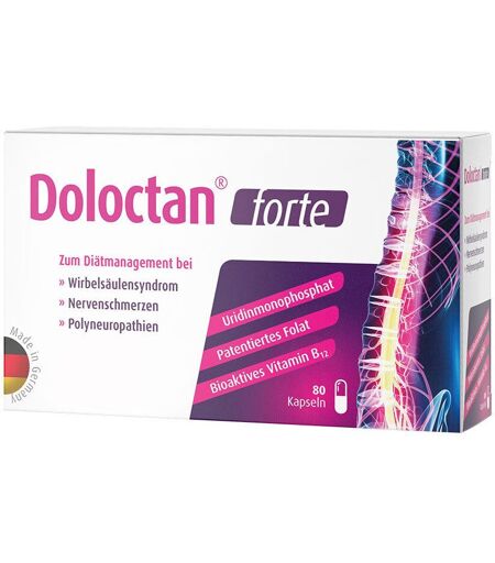 Bitte achten Sie auf eine ausgewogene und abwechslungsreiche Ernährung und eine gesunde Lebensweise. Bei Wirbelsäulensyndrom, Nervenschmerzen und Polyneuropathien Speziell abgestimmte bioaktive körperidentische Nervenbausteine mit patentiertem Folat Lebensmittel für besondere medizinische Zwecke (Bilanzierte Diät) Ihre Vorteile der Doloctan Kapseln von doloctan GmbH: Speziell abgestimmte bioaktive körperidentische Nervenbausteine: Uridinmonophosphat (UMP), aktive Folsäure in Form von Folat und Vitamin B12 als Methylcobalamin Wirksamkeit wissenschaftlich bestätigt Nur 1 Kapsel pro Tag 100 % vegan und frei von Gluten, Laktose und Soja Unser Produkt wird regelmäßig von deutschen und unabhängigen Laboren geprüft Entwickelt und produziert von unseren Pharma-Experten in unserer Zentrale im hessischen Nauheim Schon gewusst? Um die Aufnahme im Körper zu gewährleisten, enthält Doloctan® forte ausschließlich körperidentische und bioaktive Substanzen. Uridinmonophosphat (UMP) ist als essentieller Baustein der Nukleinsäuren dafür verantwortlich, dass im Organismus neue RNA, auch bei Nervenschädigungen, aufgebaut wird. Weiterhin fördert es die Proteinbiosynthese und beschleunigt den Wiederaufbau neuronaler Membranen. Die beiden B-Vitamine Folat (bioaktive Form der Folsäure) und B12 arbeiten im Körper sehr eng zusammen und spielen eine essentielle Rolle für den Nervenstoffwechsel. B12 ist beispielsweise an der Bildung der Myelinschicht (Schutzhülle der Nervenzelle) beteiligt.Zutaten:Füllstoff mikrokristalline Cellulose, Natriumsalze von Uridinmonophosphat, Hydroxypropylmethylcellulose (Kapsel), (6S)-5-Methyltetrahydrofolat Glucosaminsalz (Quatrefolic®, aktive Folsäure), Methylcobalamin (Vitamin B12).Nährwerte: Durchschnittliche Nährwerte pro 100 g pro 1 Kapsel* Brennwert (kJ/kcal) 1434 / 338 2,7 / 0,6 Fett, davon-gesättigte Fettsäuren 1 g < 0,5 g < 0,2 g < 0,2 g Kohlenhydrate, davon-Zucker 70,1 g < 0,5 g < 0,2 g < 0,2 g Eiweiß 12 g < 0,2 g Salz 8,2 g < 0,2 g Uridinmonophosphat 26 g 50 mg Methyltetrahydrofolat 209 mg 400 µg Methylcobalamin 1,6 mg 3 µg *täglich empfohlene Verzehrmenge. Verzehrempfehlung: Täglich 1 Kapsel mit ausreichend Flüssigkeit (ca. 200 ml) verzehren. Eine längerfristige und regelmäßige Einnahme wird empfohlen. Bei Bedarf kann die Kapsel auch geöffnet und das Pulver direkt verzehrt werden.Hinweis: Die täglich empfohlene Verzehrmenge darf nicht überschritten werden.Lagerungshinweis:Außerhalb der Reichweite von Kindern aufbewahren. Kühl, trocken und lichtgeschützt aufbewahren.Nettofüllmenge:80 vegetarische HartkapselnHerstellerdaten: doloctan GmbH Industriestraße 29 64569 Nauheim ...
