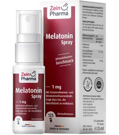 Anwendungsgebiet von Melatonin+ 1mg Spray von ZEINpharmaMelatonin+ 1mg Spray von ZEINpharma ist ein Nahrungsergänzungsmittel mit Melatonin, Passionsblumen- und Zitronenmelissen Extrakt in Mundsprayform und dem Zusatz an natürlichem Aroma aus schwarzen Johannisbeeren.Wirkungsweise von Melatonin+ 1mg Spray von ZEINpharmaMelatonin ist ein Hormon, das vor allem vom Gehirn in der Zirbeldrüse gebildet wird. Der Körper stellt es aus Serotonin her, wobei die Synthese durch Licht gehemmt wird. Erst bei Dunkelheit im Laufe der Nacht steigt die Melatonin-Konzentration bis zum Zwölffachen an. Das gilt für junge Menschen, bei Älteren steigt die Konzentration oft nur noch bis zum Dreifachen. Das Maximum wird gegen 3 Uhr morgens erreicht, anschließend fällt die Konzentration wieder ab. Tagsüber zirkuliert nur wenig Melatonin im Blut. Das flüssige Melatonin ist optimal für Personen, die eine reine - und flüssige Applikation wünschen. Die Aufnahme vom Körper wird direkt über die Mundschleimhaut in den Blutkreislauf gewährleistet weswegen es kurz vor dem Schlafengehen eingenommen werden kann und nicht wie bei Kapseln 30-60 Minuten vor dem Schlafengehen. Ein weiterer Vorteil ist die Umgehung des Magen-Darm-Trakts, was besonders für Menschen mit Resorptionsstörungen (beeinträchtigte Aufnahme von Nährstoffen durch den Darm) von Vorteil ist.Wirkstoffe / Inhaltsstoffe / ZutatenZutaten von Melatonin+ 1mg Spray von ZEINpharma: Wasser, Verdickungsmittel: Xylitol (25%) und Xanthan, Passionsblumenextrakt, Zitronenmelissen Extrakt, Melatonin,