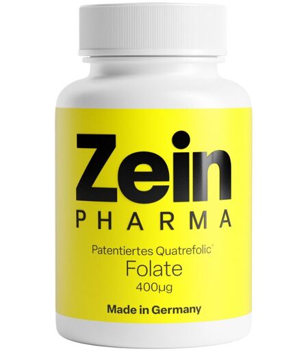 Nahrungsergänzungsmittel sind kein Ersatz für eine ausgewogene und abwechslungsreiche Ernährung und eine gesunde Lebensweise.Zein Pharma® Folate Quatrefolic® 400µg Premium Folsäure Quatrefolic®: Die enthaltene Folsäure liegt in ihrer biologisch aktiven Form vor und weist eine exzellente Bioverfügbarkeit auf Optimale Dosierung: Nur eine Kapsel pro Tag Leichte Anwendung: Die kleine Kapsel einfach mit ausreichend Wasser schlucken Unterstützung der Gesundheit: Folsäure trägt zur gesunden Aminosäuresynthese, Blutbildung, psychischen Funktion, zum Immunsystem und zum Homocystein-Stoffwechsel bei. Sie verringert Müdigkeitserscheinungen und hat eine Funktion bei der ZellteilungZutaten:Füllstoff: mikrokristalline Cellulose, Hydroxypropylmethylcellulose (Kapsel), Antioxidationsmittel: Ascorbylpalmitat, Folsäure (als (6S)-5-Methyltetrahydrofolat-Glucosaminsalz, Quatrefolic®).Nährwertangaben: Nährwert pro Kapsel Folsäure (Quatrefolic®) 400 µg Verzehrempfehlung:Täglich unzerkaut 1 Kapsel mit ausreichend Wasser.Hinweis:Die angegebene empfohlene tägliche Verzehrmenge darf nicht überschritten werden. Aufbewahrung: Kühl (6-25 °C) und lichtgeschützt lagern. Außerhalb der Reichweite von kleinen Kindern aufbewahren.Nettofüllmenge: 120 KapselnHerstellerdaten: ZeinPharma Germany GmbH Industriestraße 2964569 Nauheim ...
