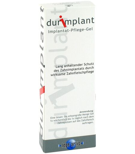 Anwendungsgebiet von Durimplant Implantat Pflege GelDurimplant Implantat Pflege Gel pflegt Zahnfleisch und Mundschleimhaut und beugt Entzündungen in der Umgebung von Zahnimplantaten (Periimplantitis) vor.Wirkungsweise von Durimplant Implantat Pflege GelDurimplant Implantat Pflege Gel ist ein visköses Gel, welches nach Auftragen auf die Mundschleimhaut eine dünne, weiche Schutzschicht bildet. Aufgrund der wasserabweisenden Eigenschaften ist eine sehr gute Haftung und somit lange Wirkung gegeben. Am Implantat aufgetragen entfaltet Durimplant Implantat Pflege Gel seine pflegenden und beruhigenden Eigenschaften, die hauptsächlich durch enthaltenes Allantoin und Salbei bewirkt werden. Zusätzlich kann das Gel bei allen leichten Entzündungen, Irritationen und Druckstellen im Mund- und Rachenbereich angewendet werden. Entzündungen werden gehemmt, die natürliche Wundheilung unterstützt und Ihr Wohlbefinden wieder hergestellt.Wirkstoffe / Inhaltsstoffe / ZutatenDurimplant Implantat Pflege Gel enthält: