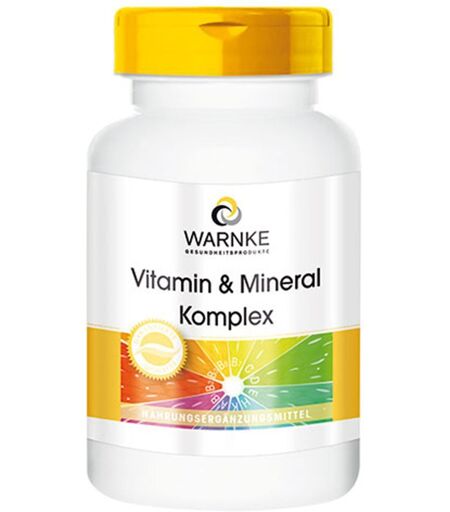 Nahrungsergänzungsmittel sind kein Ersatz für eine ausgewogene und abwechslungsreiche Ernährung und eine gesunde Lebensweise. Nahrungsergänzungsmittel mit Vitamin & Mineral KomplexZutaten: Calciumhydroxid, L?Ascorbinsäure, Magnesiumoxid, Überzugsmittel Hydroxypropylmethylcellulose (Kapselhülle), DL?alpha?Tocopherylacetat, Eisen?II?sulfat, Nicotinamid, Selenhefe (enthält 0,2% Selen), Calcium?D?pantothenat, Trennmittel Magnesiumsalze von Speisefettsäuren, Pyridoxinhydrochlorid, Zinkoxid, Thiaminmononitrat, Riboflavin, Beta?Carotin, Cholecalciferol, D?Biotin, Pteroylmonoglutaminsäure, Kaliumjodid, Cyanocobalamin, Farbstoff (Kapselhülle) Inhalt pro Kapsel % NRV Vitamin B1 4,5 mg 409 Vitamin B2 5,1 mg 364 Niacin 54 mg 338 Pantothensäure 18 mg 300 Vitamin B6 5,1 mg 386 Vitamin B12 7 µg 280 Biotin 200 µg 400 Folsäure 200 µg 100 Vitamin C 175 mg 219 Vitamin D3 5 µg 100 Vitamin E 30 mg 250 Calcium 200 mg 25 Magnesium 100 mg 27 Eisen 18 mg 129 Zink 5 mg 50 Selen 50 µg 91 Jod 60 µg 40 Beta-Carotin 2 mg - Nährwert pro 100 g Energie 117 kCal / 490 kJ Fett 37 mg - dav. ges. Fettsäuren Kohlenhydrate 11,7 g - dav. Zucker - mehrwertige Alkohole Eiweiß 37,3 mg Salz 728 mg Verzehrempfehlung: Erwachsene täglich 1 Kapsel zu einer Mahlzeit mit viel Wasser.Hinweis:Die angegebene empfohlene Tagesmenge darf nicht überschritten werden.Aufbewahrung: Kühl (6-25 °C) und lichtgeschützt lagern. Außerhalb der Reichweite von kleinen Kindern aufbewahren.Nettofüllmenge: 291g/ 250 KapselnHersteller: Warnke Gesundheitsprodukte GmbH & Co KG Rheinische Allee 4D?50858 Köln ...