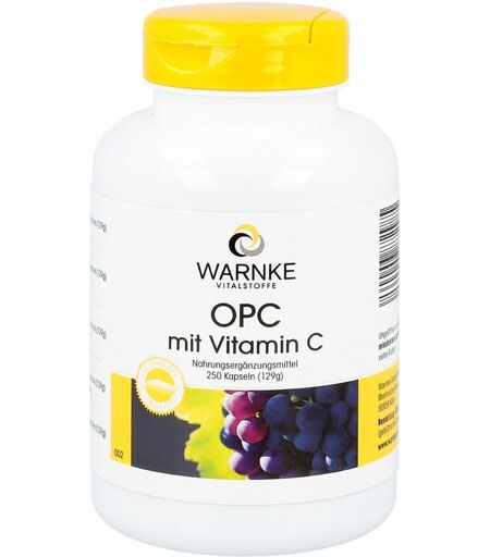 Anwendungsgebiet von Opc 200 Bioflavonoide KapselnOpc 200 Bioflavonoide Kapseln ist ein Nahrungsergänzungsmittel mit Vitamin C und OPC. Wirkstoffe / Inhaltsstoffe / ZutatenZutaten von Opc 200 Bioflavonoide Kapseln: Traubenschalen-Extrakt (42% davon OPC 30%), L-Ascorbinsäure (42%), Überzugsmittel Hydroxypropylmethylcellulose (Kapselhülle), Trennmittel Magnesiumsalze von Speisefettsäuren Zusammensetzung von Opc 200 Bioflavonoide Kapseln: Traubenschalenextrakt 200 mg davon OPC 60 mg Vitamin C synthetisch 200 mg 250 % NRV Nährwert Pro 100g von Opc 200 Bioflavonoide Kapseln: Energie 253 kcal / 1059kJ Fett 2,4g davon gesättigte Fettsäuren 0,6g Kohlenhydrate 21,9g davon Zucker 2,3g mehrwertige Alkohole Eiweiß 4,0g Salz 920mg GegenanzeigenBei bekannter Überempfindlichkeit gegenüber einem der oben genannten Inhaltsstoffe sollte dieses Produkt nicht angewendet werden. Frei von Allergenen DosierungNehmen Sie täglich 1 Kapsel von Opc 200 Bioflavonoide Kapseln jeweils mit einem Glas Wasser zu einer Mahlzeit ein. HinweiseNahrungsergänzungsmittel sollten nicht als Ersatz für eine ausgewogene, abwechslungsreiche Ernährung und gesunde Lebensweise verwendet werden. Die täglich empfohlene Verzehrmenge sollte nicht überschritten werden. Opc 200 Bioflavonoide Kapseln sollten außerhalb der Reichweite von Kindern aufbewahrt werden. Nicht über 25 °C aufbewahren. Vor Licht und Feuchtigkeit schützen. Opc 200 Bioflavonoide Kapseln können in Ihrer Versandapotheke www.juvalis.de erworben werden. ...