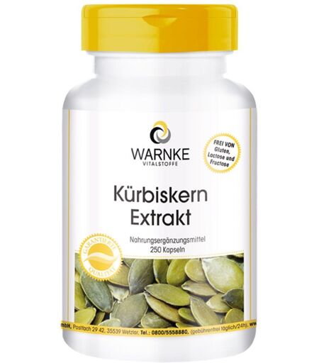 Nahrungsergänzungsmittel sind kein Ersatz für eine ausgewogene und abwechslungsreiche Ernährung und eine gesunde Lebensweise.Kürbiskern ExtraktZutaten:Kürbiskernextrakt (80%), Überzugsmittel Hydroxyprophylmethylcellulose (Kapselhülle),D‐alpha‐Tocopheylacetat, Selenhefe (0,8% enthält 0,2% Selen), Trennmittel Magnesiumsalze vonSpeisefettsäuren, Trennmittel Siliciumdioxid. Frei von Allergenen Nährwerte pro Kapsel pro 100 g % NRV* Energie - 1738 kJ / 415 kcal - Fett - 15,2 g - Kohlenhydrate - 57,0 g - Eiweiß - 15,2 g - Salz - 903 mg - Jod Kürbiskern Extrakt 10:1 500 mg - - Vitamin E 20 mg a-TE - 166 % Selen 10 µg - 18 % *Empfohlene Tagesverzehrsmenge nach Nährwert-Kennzeichnungsverordnung (NKV)Verzehrsempfehlung: Erwachsene täglich 1 Kapsel zu einer Mahlzeit mit viel Wasser.Hinweis:Die angegebene empfohlene Tagesmenge darf nicht überschritten werden. Aufbewahrung: Kühl (6-25 °C) und lichtgeschützt lagern. Außerhalb der Reichweite von kleinen Kindern aufbewahren.Nettofüllmenge: 250 Kapseln = 156 gHerstellerdaten: Warnke Gesundheitsprodukte GmbHRheinische Allee 4D-50858 Köln ...