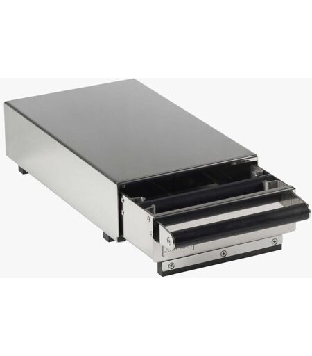 fer an der Vorderseite. Der Abschlagbalken besteht aus massivem Aluminium und einer Silikon-Ummantelung. Außerdem ist er nur über das Silikon mit dem Gehäuse verbunden, so dass der Schlag nicht auf das Gehäuse übertragen wird. Die Stellfläche besitzt die Maße 23 cm x 30 cm (35 cm mit Griff) x 11 cm. ...